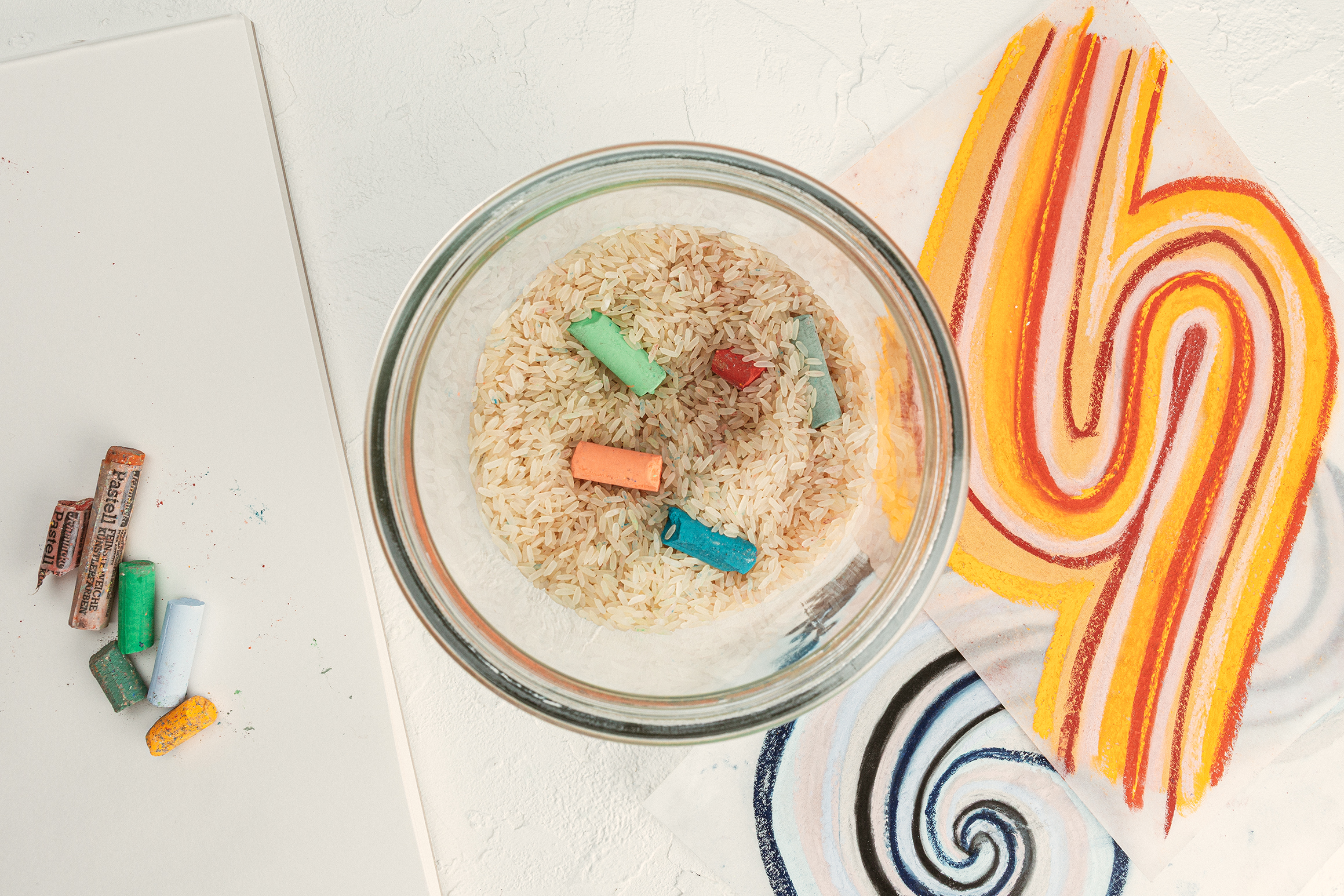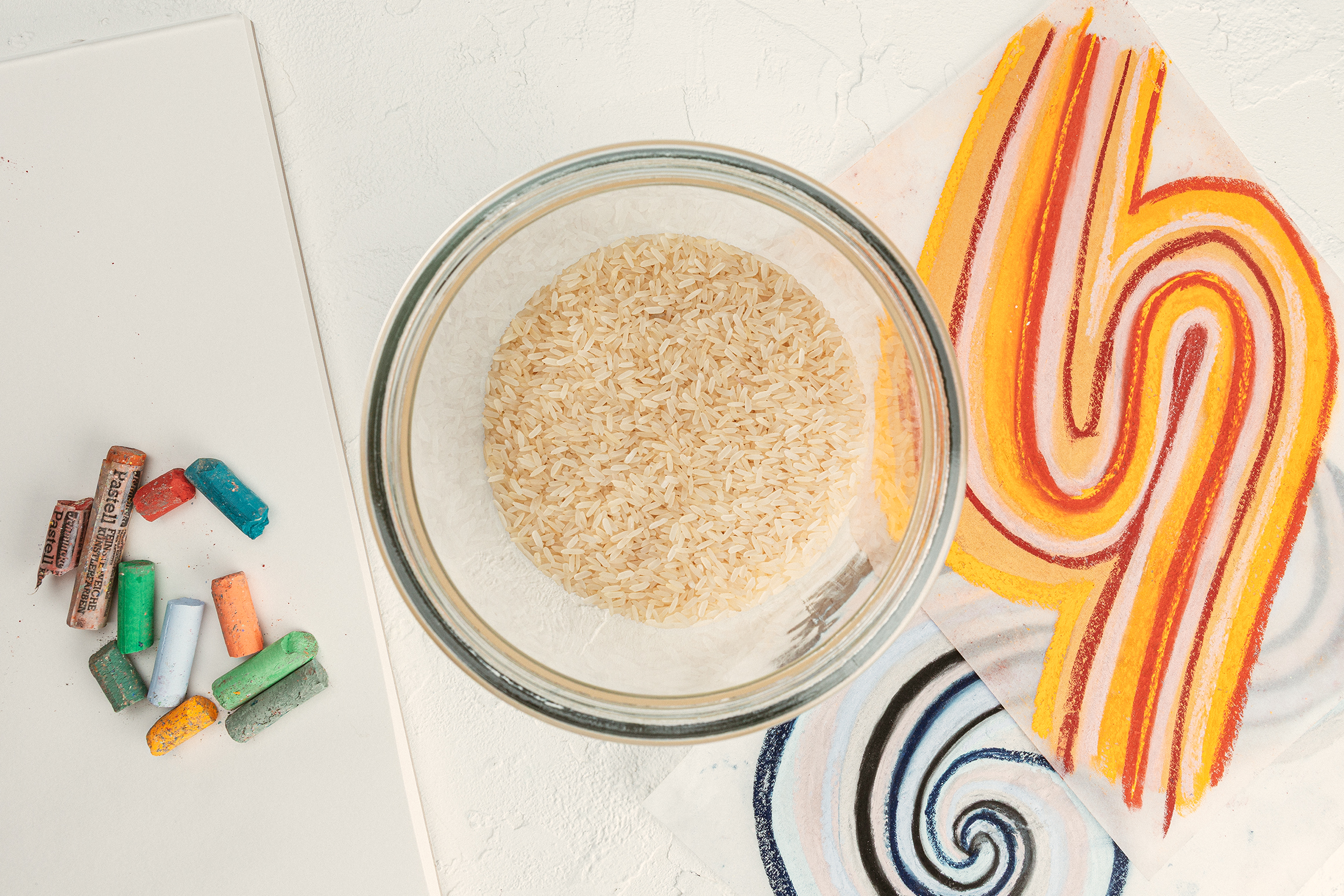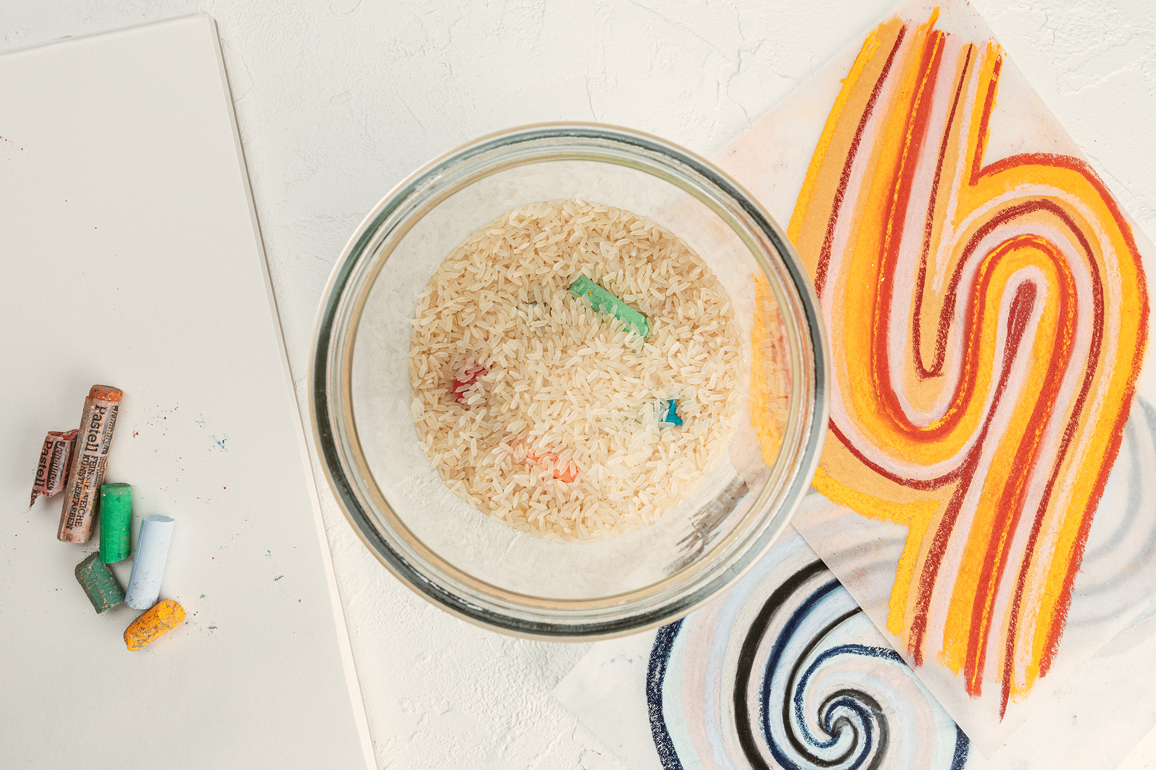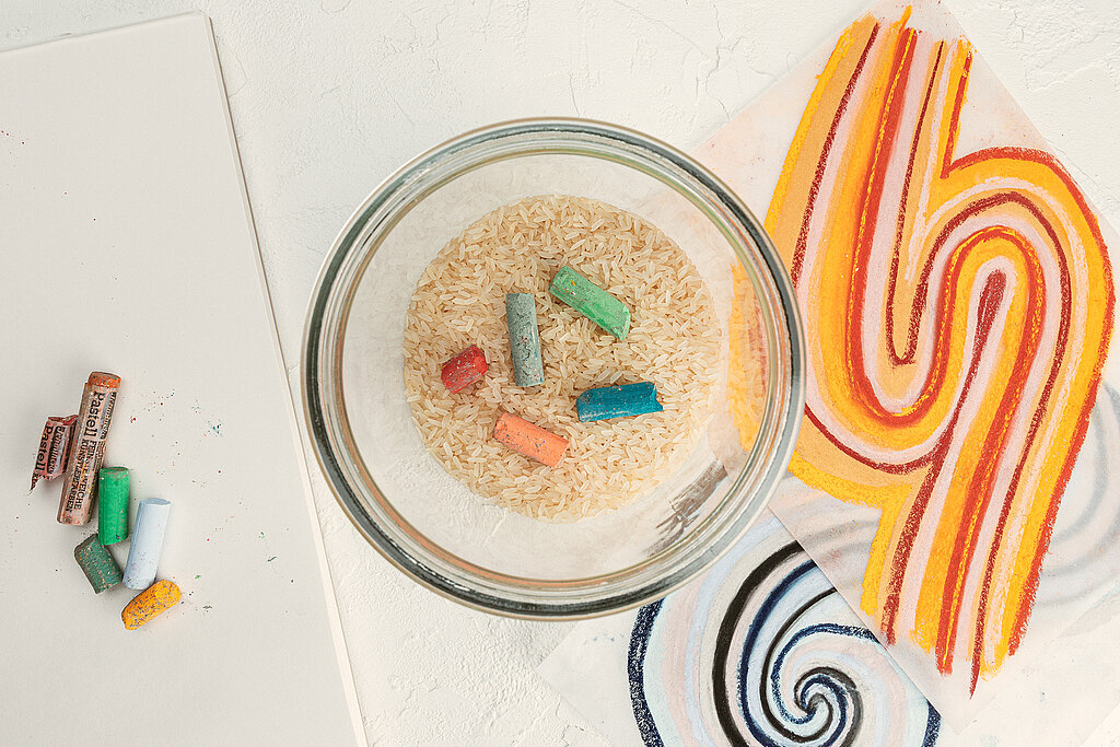 So reinigst du Pastelle mit Reis:Vorbereitung: Gib eine geringe Menge ungekochten Reis in eine flache Schale oder einen Behälter (z.B. Marmeladenglas).