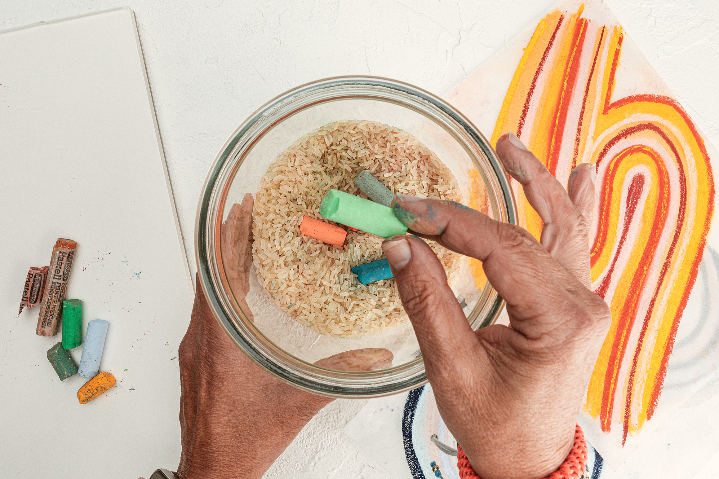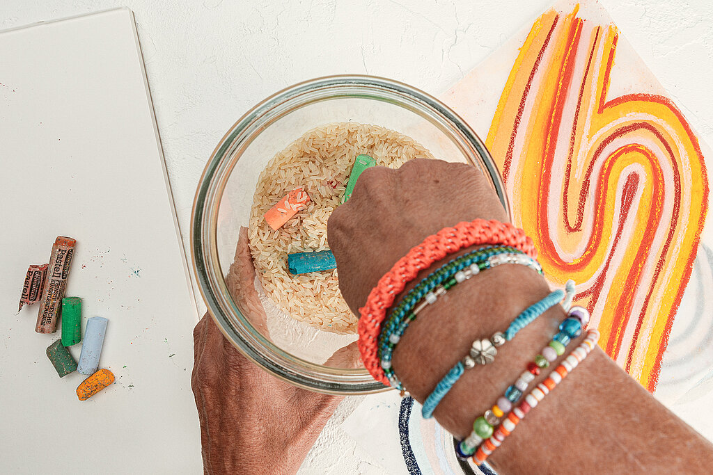 Reinigung: Lege die verschmutzten Pastelle sanft in den Reis und rolle sie dort hin und her. Der Reis nimmt lose Farbpigmente und Staub auf.