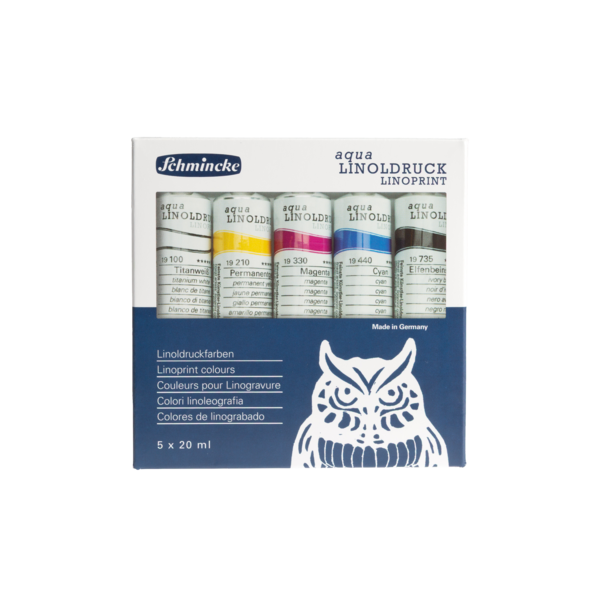 Im Bereich der Linoldruckfarben bietet Schmincke neben einem aqua Linoldruck-Kartonset auch einen College Linol-Malkasten an. Beide sind coloristisch sinnvoll gewählt und im kompakten Kartonset erhältlich.