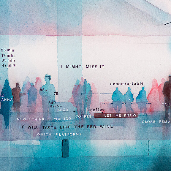 Das Bild, das in London hängt, heißt „The Delay“. Ich glaube, jeder, der schon einmal am Bahnsteig auf einen verspäteten Zug gewartet hat, erkennt sich in diesen Menschen und ihren Gedanken sowie in den Nachrichten wieder, die sie tippen und lesen.